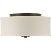 Introducing the Progress Lighting Inspire Collection, a timeless blend of traditional forms and modern elegance. Crafted from durable steel with an antique bronze finish, the 13" wide, 5.5" high, and 13" long flush mount fixture exudes a classic charm. The two-light design, suitable for damp areas, features an etched glass diffuser and an off-white linen shade, creating a warm and inviting ambiance. With a hanging method that ensures a seamless fit to the ceiling, this incandescent fixture with a wattage of 60 watts offers a perfect balance of style and functionality. The product includes a canopy with a diameter of 8.25" and a matching shade measuring 13" x 13" x 4.5". Elevate your space with the Inspire Collection's timeless appeal and graceful lines.