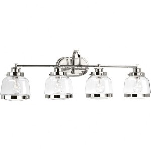 Introducing the Judson collection from Progress Lighting, featuring a timeless clear schoolhouse-style globe and metal fittings for a vintage look. Made of durable steel with a polished nickel finish, this four-light bath and vanity fixture is the perfect complement to farmhouse or coastal-inspired homes. With a width of 35.75", height of 11.25", and depth of 8.5", this damp-rated fixture is suitable for various spaces. The fixture uses incandescent bulbs with a wattage of 75 watts, providing ample illumination. The mounting direction can be adjusted for up or down lighting, and the included shade measures 6.5 x 5.25 inches. Elevate your space with the timeless elegance of the Judson collection.