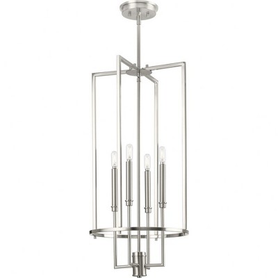 Introducing the Parkhurst Collection from Progress Lighting, featuring an elegant foyer light crafted from steel with a brushed nickel finish. The graceful curves and bold angles create a softly structured look, allowing unobstructed layers of light. This 20" wide, 36" high, and 20" long fixture comes with a 72" chain and is designed for dry rated areas. With its new traditional, modern farmhouse, and transitional style, it's perfect for hallways, foyers, great rooms, and kitchens. The fixture accommodates 8 incandescent candelabra style bulbs, each with a maximum wattage of 60 watts, providing a luxurious touch and ideal illumination. Fully dimmable when used with dimmable bulbs, it includes installation instructions and mounting hardware. Backed by a 1-Year Limited Warranty, this elegant foyer light is sure to enhance your space and provide ambient light.