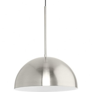 Introducing the Perimeter Pendant from Progress Lighting's collection. Crafted from durable steel with a brushed nickel finish, this iconic modern design features a sleek metal dome that adds a bold statement to mid-century modern and contemporary interiors. The white interior circular open shade casts generous light, making it perfect for kitchens and breakfast nooks. Measuring 15.75" in width and 8.62" in height, this dry rated pendant requires 1 incandescent bulb with a maximum wattage of 100 watts (sold separately). The 120" black cord allows for versatile installation on various ceiling heights, including sloped ceilings. Backed by a 1-Year Limited Warranty, this pendant includes installation instructions and mounting hardware for easy setup. Elevate your space with the Perimeter Pendant's elegant and functional design.