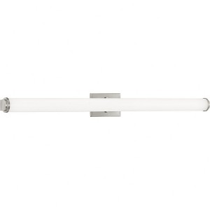 Introducing the Phase 1.1 Collection 48in. Linear bath bar by Progress Lighting. Crafted from durable aluminum with a sleek brushed nickel finish, this fixture is designed to elevate any space. The cylindrical acrylic diffuser and simple rectangular back plate create a modern and versatile look suitable for residential, light commercial, and multi-family applications. With an integrated LED source, this bath bar provides uniform illumination while offering energy and cost savings benefits. The 48" width, 4.75" height, and 4" depth make it a perfect fit for various spaces. It can be installed vertically or horizontally, and the damp rating ensures its suitability for any bathroom. The 3000 Kelvin color temperature, 90 CRI, and 3500 lumens deliver a warm and inviting light. With a mounting direction of up or down, and a shade included, this bath bar offers both style and functionality. Elevate your space with the Phase 1.1 Collection 48in. Linear bath bar from Progress Lighting.