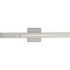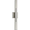 Introducing the Planck LED wall fixture from Progress Lighting. Crafted from durable steel with a brushed nickel finish, this sleek and modern fixture measures 4.75" in width, 24" in height, and 4.75" in length, with a depth of 3". The fixture features indirect illumination, creating a dramatic architectural feature in any space. With a moisture rating of Damp Rated, it is suitable for both residential and commercial applications. The fixture includes 2 LED bulbs with a total wattage of 32 Watts, providing a high CRI of 90 and a color temperature of 3000 Kelvin, producing 1147 lumens. The minimalist form is accented by a sleek chrome detail, adding visual interest to the design. The fixture can be installed vertically or horizontally, offering versatility in placement. The backplate measures 4.75" in width and length, with a height of 4.75". The shade is included, measuring 11.25" x 1.63". Elevate your space with the modern and functional design of the Planck LED wall fixture.