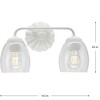 Elevate your space with the Quillan Collection's Two-Light Vanity Light. Crafted from durable steel with a hand-painted white plaster finish and soft gold accents, this fixture showcases scalloped elements and clear, elliptical glass shades for a touch of sophistication. The versatile design allows for upward or downward mounting, casting focused light through the bell shades to enhance any room's ambiance. The dimensions are W 6.62" x H 8.5" x L 14.5", with a backplate of W 5.12" x L 1.62". It uses incandescent bulbs, is damp rated, and comes with easy installation instructions and hardware. This dimmable light fixture is cETLus listed for damp locations and comes with a 1-year limited warranty. Ideal for modern organic, global, or transitional decors, the Quillan Two-Light Vanity Light adds a timeless, soft touch to your bathroom or vanity area.