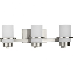 Elevate your bathroom's ambiance with the Reiss Collection from Progress Lighting. This sleek brushed nickel vanity light fixture is crafted from durable steel and complements modern farmhouse and contemporary decors. The polished concentric band and simple white glass shade create a sophisticated and balanced look. The fixture provides ample illumination with three incandescent bulbs (100 watts each, not included) and has a moisture rating of damp, making it ideal for bathrooms or covered outdoor areas. It can be installed with the shades facing up or down and measures 22.75 inches in length, 7 inches in height, and extends 5.75 inches from the wall. The Reiss vanity light is cULus Damp Location listed, comes with a 1-Year Limited Warranty, and includes instructions and mounting hardware for easy installation.