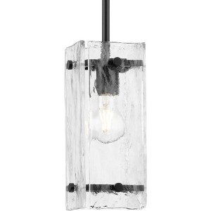 Introducing the Rivera Collection from Progress Lighting, where luxurious lighting meets modern craftsmanship. The Rivera fixture is crafted from steel with a matte black finish, measuring 4.75" in width, 10.5" in height, and 4.75" in length. This damp-rated fixture features a 3" chain length and uses incandescent lighting with a 60-watt capacity. The design showcases linear segments in rich black tones framing handcrafted, clear textured glass, creating an otherworldly effect. This fixture is part of the Progress Lighting Design Series, offering fashionable styles and affordable luxury for the home. It is perfect for accenting dining rooms, great rooms, and bathrooms, adding a touch of modern craftsman-inspired design to any space. The fixture comes with a 1-year limited warranty, installation instructions, and mounting hardware for easy installation. Illuminate your space with the Rivera Collection and indulge your artistic sensibility with its luxurious and modern design.