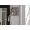 Introducing the Rushton one-light bath fixture from Progress Lighting. Crafted from durable steel with a graphite finish, this timeless piece adds functional lighting and decorative charm to any space. The fixture measures 5" in width, 9.5" in height, and 5" in length, with a depth of 6" and a height from the outlet box of 6.5". The backplate is 5" in width and 6" in length. The fixture uses incandescent lighting with a 60-watt capacity and is damp rated for versatile use. The clear glass shade surrounds a single exposed bulb, creating a vintage look. The industrial design, featuring a faux cord and miniature pulley wheel, makes it ideal for industrial and farmhouse settings. Mounting direction can be adjusted for up or down lighting. The shade dimensions are 4.5 x 4.5 x 5.25 inches. Perfect for use as a bath vanity or wall sconce, the Rushton one-light bath fixture combines style and functionality to enhance any interior space.