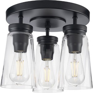 Elevate your space with the Stockbrace Collection 3-Light Matte Black Flush Mount Ceiling Light. Crafted from durable steel with a timeless matte black finish, this 12.5" wide and long, 10" high fixture seamlessly fits into any room with lower ceilings. Equipped with three 60-watt incandescent bulbs, it provides ample illumination and a warm ambiance. The clear glass shades enhance the farmhouse-inspired look, creating a bright and inviting glow. Rated for damp locations, this versatile fixture includes a 11.06" diameter canopy for a cohesive and polished appearance. Embrace both functionality and style with this elegant addition to the Stockbrace Collection.