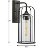Introducing the Progress Lighting Watch Hill Collection 1-Light Textured Black Clear Seeded Glass Farmhouse Outdoor Medium Wall Lantern Light. This outdoor light fixture is crafted from durable aluminum with a timeless textured black finish, evoking the charm of Victorian-era gaslight fittings. The elongated cage design and gracefully curving slender arms create a classic look, while the clear seeded glass shade adds a touch of elegance. With a width of 8.75", height of 17", and length of 7.5", this wet-rated light is suitable for outdoor use. It features a single incandescent bulb with a wattage of 60 watts, providing warm and inviting illumination. The backplate dimensions are 4.5" in width and 9" in length, and the light is designed to be mounted 12.37" from the outlet box. Bring a touch of vintage charm to your outdoor space with the Watch Hill Collection wall lantern light.