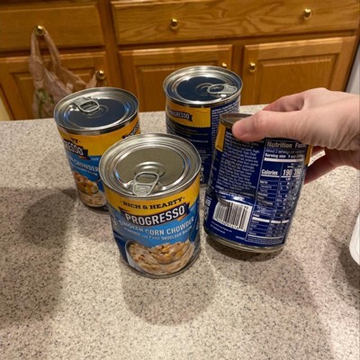 - CONTAINS: One 18.5 oz can of shelf-stable Progresso Rich and Hearty Chicken Corn Chowder Soup, flavored with bacon; About two servings per can