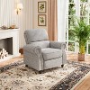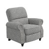 Sit back and relax in this 2-position pushback recliner chair covered in a soft to the touch gray chenille fabric. Traditionally styled, this chair has a square bustle back, generous seat size, rolled arms and hand-tacked antique bronze nailhead trim. Simply push back to recline, no levers or buttons required. Solid wood legs in a dark brown finish are turned in the front and angled in the back.