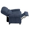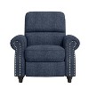 Sit back and relax in this 2-position pushback recliner chair covered in a soft to the touch navy blue chenille fabric. Traditionally styled, this chair has a square bustle back, generous seat size, rolled arms and hand-tacked antique bronze nailhead trim. Simply push back to recline, no levers or buttons required. Solid wood legs in a dark brown finish are turned in the front and angled in the back.