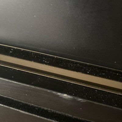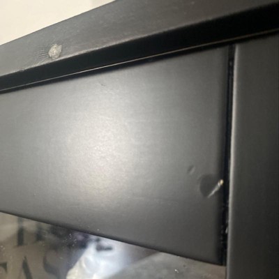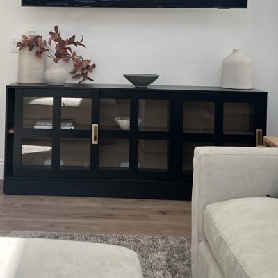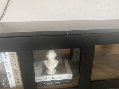 A: The TV stand features sliding doors with clear glass panes and a gold-tone pull.
