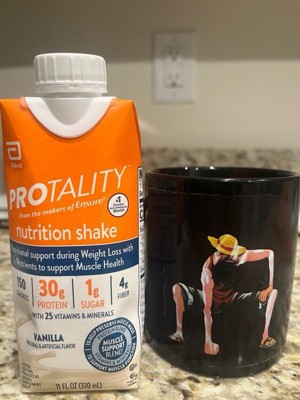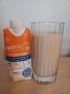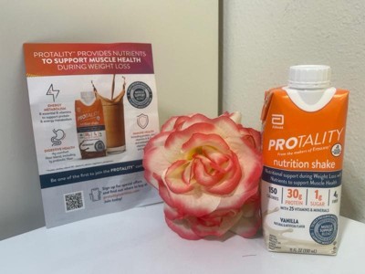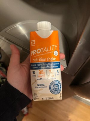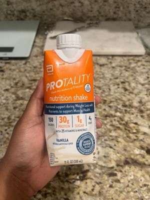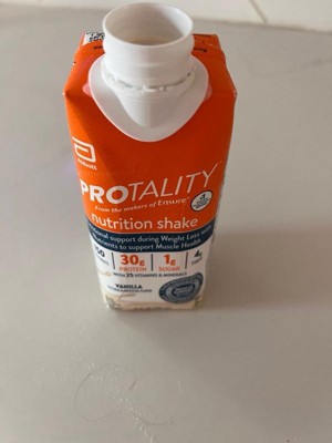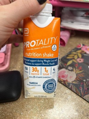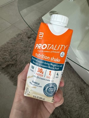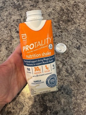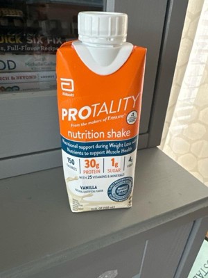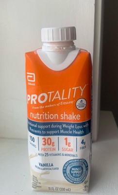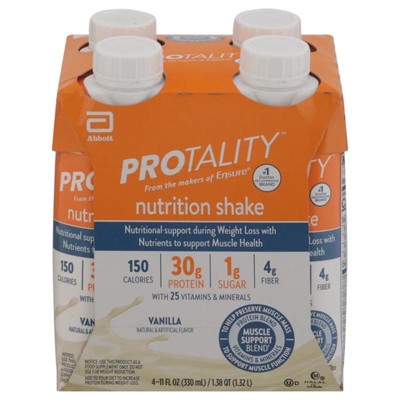 A PROTALITY shake is nutrition support for muscle health during weight loss, with 30g of high-quality protein, 1g of sugar, and 150 calories. Delivering targeted nutrition to help you stay active,* PROTALITY has protein to support muscle health and 8 essential B vitamins for energy metabolism. Each shake has 4g of fiber to support digestive health and 25 vitamins & minerals. PROTALITY is from the makers of Ensure, the #1 doctor-recommended brand.† This product is gluten-free and suitable for lactose intolerance.‡ * Use as a part of a nutritionally balanced diet with exercise. † Among doctors who recommend liquid nutritional products to their patients. ‡ Not for people with galactosemia.