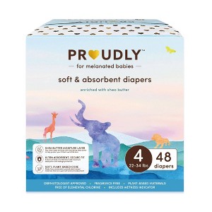 The PROUDLY Soft & Absorbent Diapers help keep leaks locked-in when your littlest love is movin’ and groovin’. Designed with superior stretch for growth spurts and transition sizing, ultra-absorbency, comfort fit, and a wetness indicator. Because bum care is skin care, we’ve enriched the inner layer with shea butter to add moisture for melanated skin. Made with love with our signature “Littlest Love” print featuring the beautiful range of melanated skin tone hearts. Use as a part of a Bum Care Routine with PROUDLY Gentle Touch Baby Wipes and Soothing Diaper Cream.