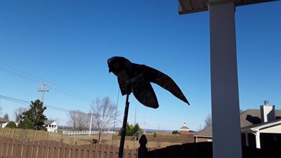 Our predator owl has worked wonders from the minute he was installed on a PVC pipe by our pool deck. We had a terrible problem with birds flying over the pool and doipping presents in the pool and on the deck. The minute the owl was installed and started moving in the wind, the birds changed their course and go around the pool completely.