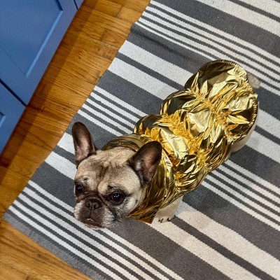It was difficult to find a jacket for our newly adopted Frenchie. He’s a size L but when it fits his neck and chest, the back is too long. Tip: Got creative with this one, rolled the collar over and fastened the Velcro closure, made my own opening to insert/attach leash to harness, Velcro closures under belly are exactly where they should be. Fits perfectly! He’s getting so many compliments! Who knew?!! I just needed to find a jacket that would work for him and this is the one! PS purchased both silver and gold so he has options 🥰