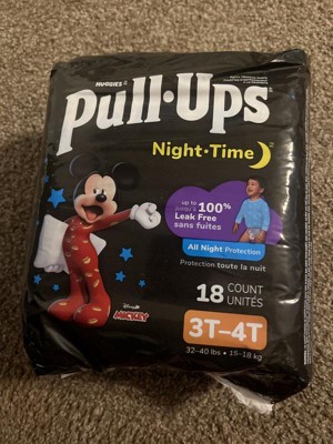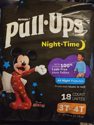Make potty training a routine with Pull-Ups Night-Time Training Pants for Boys! Pull-Ups Night-Time Potty Training Pants absorb up to 25% more than diapers* and are up to 100% leak-free with extra absorbency compared to our other Pull-Ups products. Not only that, but these potty training underwear deliver up to 12 hours of overnight protection where boys need it most. Refastenable, easy-open sides allow you to keep clothing on your toddler for quick changes, even in the middle of the night. Each Pull-Ups training pant is made with soft and breathable materials, so your Big Kid can stay comfortable as they sleep. They also feature stretchy sides and an underwear-like fit so you can train consistently from day to night. Our nighttime potty training pants feature Disney designs of Mickey Mouse, with graphics that fade when wet to help your child learn and celebrate dry nights. No matter where your child is in his potty training journey, the Pull-Ups brand can help. Visit the Pull-Ups website for expert articles, tips and potty training resources. We've helped train 60 million Big Kids and counting! Pull-Ups Night-Time Boys' Training Pants are available in sizes 2T-3T (16-34 lbs) and 3T-4T (32-40 lbs). (*vs. size 3-5 Huggies Little Movers diapers)