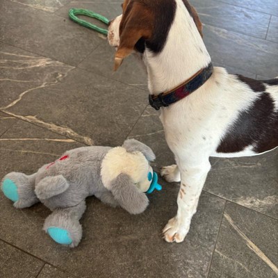 [This review was collected as part of a promotion.] We just adopted a 20 week old puppy, and she had trouble sleeping through the night. I read that dogs can go through separation anxiety at this age, so I was looking into alternatives. This was suggested, and it does help her. The heart comes out of the belly of the stuffed animal and velcros in. The battery section requires a screw driver so there is no worry for choking. I am not sure what the point of the pacifier is, because she is going to chew it up soon, and that may be a choking hazard. The dog is stuffed, so I’m not sure how long it will last. I received an incentive to write this review.