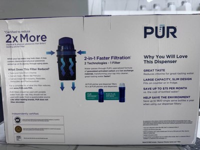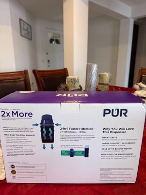 - PUR water dispenser with filter reduces certain pesticides, chlorine, and more
