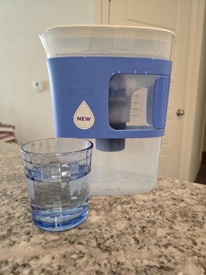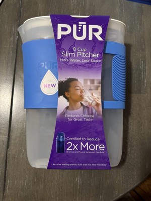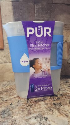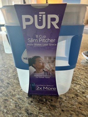 The PUR 8-Cup Slim Water Filter Pitcher is designed for great-tasting drinking water in a compact, space-saving design. Ideal for daily use in small kitchens, dorms, RVs, and offices, this water filtration pitcher fits easily in fridge doors and tight spaces. Use this pitcher for great-tasting water, controlled pouring, and high-capacity performance. The unique comfort-grip sleeve allows for a comfortable, controlled pour. Initial filter included lasts for 2 months and is PUR's fastest filter*. Use this PUR water pitcher with PUR 3-Pack Filters (PPF900Z3) for up to 6 months of powerful filtration to reduce chlorine and other contaminants. Available in three colors to match your style. *Compared with PUR PLUS pitcher filter. This water filtration system reduces contaminants and improves taste.