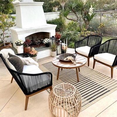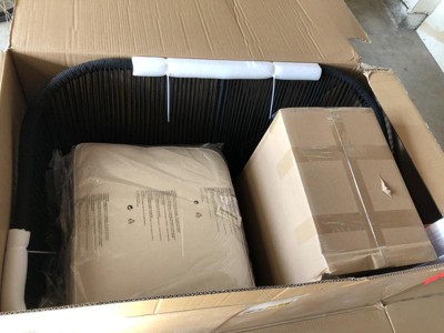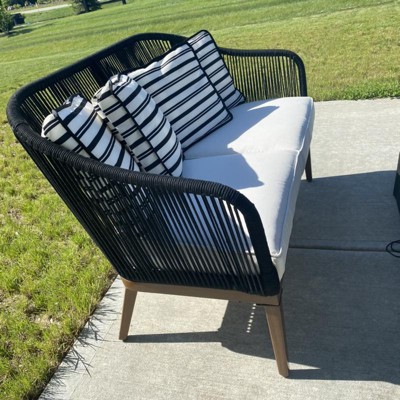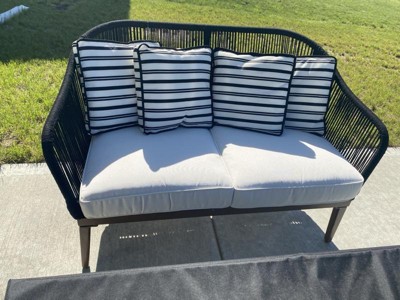 Create a comfy and stylish outdoor retreat with this Purcell Outdoor Patio Seating Collection from Threshold™. Featuring two outdoor patio chairs, a patio loveseat and a patio folding chair, this curated seating selection lets you create a welcoming vibe on your patio or porch or in the backyard. Each piece has a brown metal frame, complemented by a black woven rope-like design for an artisanal vibe. Plus, padded cushions on the loveseat and club chairs elevated your reading and relaxing experience with sumptuous comfort.
