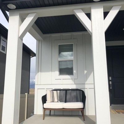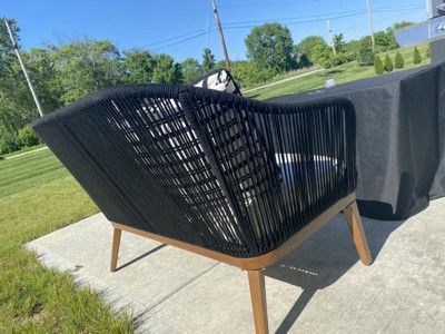 Our new loveseat is the perfect addition to our small patio. It was so easy to assemble! Just bolt on the four legs and voila! Ready to relax. I was a little nervous that the back would be uncomfortable but its great and looks so cool. The cushions are nice and sturdy but still comfortable. The frame looks like wood but is actually constructed of steel so it’s nice and sturdy.