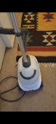 Unsturdy and falls over when using. Steam is hot, but not strong. The hose is super awkward and makes it difficult to get to the bottom of longer items without kinking or tipping the whole things over. I love using steamers because watching the wrinkles disappear is so satisfying — that never happened with this one. My clothes were still wrinkled (big and small wrinkles) no matter how many passes I made. Great price point, but you get what you pay for.