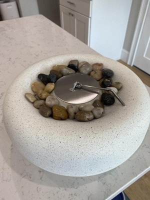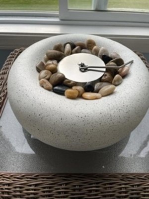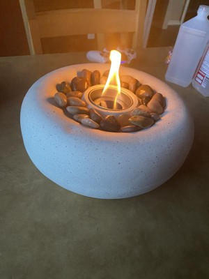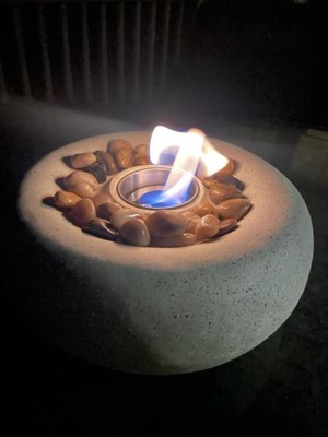 [This review was collected as part of a promotion.] This tabletop fire pit is a nice addition on a dark evening. Its fire creates a nice flickering glow which is a warm and subtle light while hanging out on the deck. It’s lighter than it looks but heavy enough that it’s not going anywhere. The small stones are a nice addition for a better look, though I would prefer to have just a few more of them. There’s no drain hole so if you leave it outside all the time it will fill with water. The wick system is not clearly explained in the instructions so I’m not sure I did that part right. The fuel is pretty much odorless and doesn’t smoke. The flames are subtle so it must be dark to enjoy the ambience, and in daylight they’re almost completely washed out. The provided metal lid is the perfect way to quench the flames when you’re done and there is essentially no assembly to it. Overall we like it a lot and it’s a nice addition to our deck.