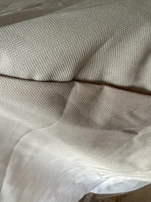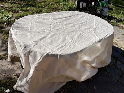 [This review was collected as part of a promotion.] I love this table cover. So far the color (beige) and quality are amazing. It is large. Has draw strings at the bottom and pockets to help to weigh it down so it won’t blow in the wind. I have not used it in inclement weather nor through a NYC winter so I don’t know how tough it really is but it seems durable to the touch. Not cheap plastic at all.