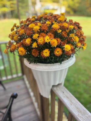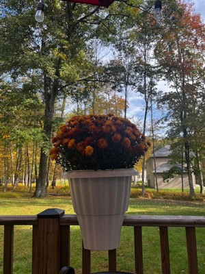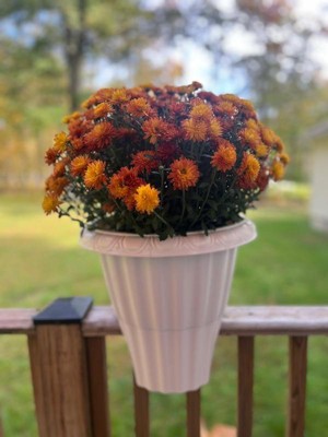 [This review was collected as part of a promotion.] What a neat idea! I love this planter! My mums fit perfectly in it, there is a raised bottom so the water goes through as not to over water the plants. It fit perfectly on my deck railing. It is weather resistant as well, I am not sure if I’d leave it out for the winter, I won’t but it’s seems pretty durable.