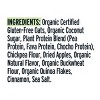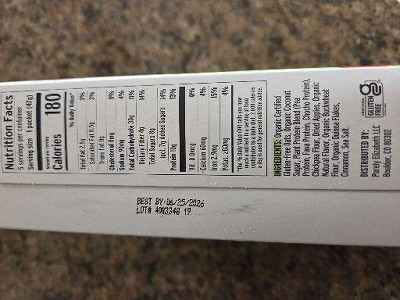 ingredients: organic certified gluten-free oats, organic coconut sugar, plant protein blend (pea protein, fava protein, chocho protein), dried apples, organic natural flavor, organic quinoa flakes, organic buckwheat flour, sea salt, cinnamon. .