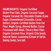 organic certified gluten-free oats, organic coconut sugar, organic coconut oil, chocolate chunks (cane sugar, unsweetened chocolate, cocoa butter), organic certified gluten-free oat flour, maple syrup, almond butter, cocoa processed with alkali, chicory root fiber, organic coconut flour, organic chia seeds, natural flavor, leavening (cream of tartar, baking soda), sea salt.