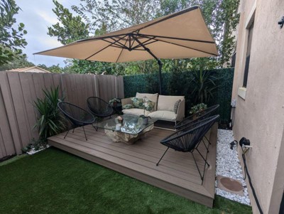 Both are in the same color so its a great addition to my backyard pool area The setup time was about 45 mins, you do need a helping hand to lift the cantilever in place, but everything else is basic instructions and uses the tools provided The cantilever works great, up and down and swings around for different sun protection angles The base needs to have a lot of weight in it in order to prevent the umbrella from blowing, so you need a combination of water and play sand to fill the basins to get to a few hundred pounds of support Great value at the prices being offered - went to a patio retail store and the prices were 5-10 times what i paid