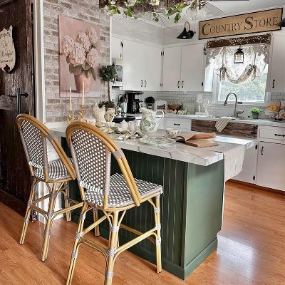 Elevate your space with the PURPLE LEAF French Bar Stool Set, blending timeless French countryside charm with durable modern design. These 30" bar-height stools feature a classic grey hue and intricately carved motifs, offering an elegant yet rustic touch perfect for kitchen islands, patios, or outdoor bars. Crafted with weather-resistant, powder-coated aluminum, these stools mimic the natural look of hand-applied bamboo print while resisting rust and fading. The double-tube thickened frame ensures stability, supporting up to 400 lbs per stool, with smooth welds for lasting security. Designed for comfort, each stool includes a built-in footrest and a woven rattan backrest, adding breathable support. The all-weather wicker and 16.5" diameter seat (set of 2) suit both indoor and outdoor use.