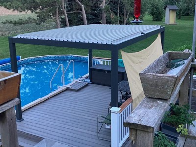 We bought the 11 x 23’ two years ago and it still looks like new Hired a contractor to set it into 6 concrete piers and hung some outdoor lights around the top perimeter Easily contains a table for 6, fire table, and outdoor seating for 6 We keep the lovers closed against the heat of sun and it keeps furniture dry in light rains Handles Illinois snow load easily and we use a leaf blower to dispense with fall litter on top Love this product and the company is responsive by chat, email, or phone if needed Happy to recommend!