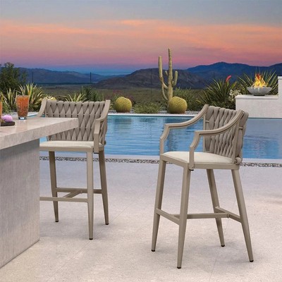 Crafted for standard bars, this stool combines a powder-coated aluminum frame with all-weather PE rattan. It features an embedded memory foam cushion, supportive armrests, and a reinforced footrest for lasting comfort and stability indoors or out.