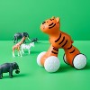 Introduce your little one to the animal kingdom with this Push-and-Go Tiger Toy from Gigglescape™. This toy features a cute tiger in an orange hue with black stripes and boasts four wheels with a floral design. They can push down on the tiger's head and let it go so it rolls on its own, helping them develop hand-eye coordination, movement and fine motor skills.