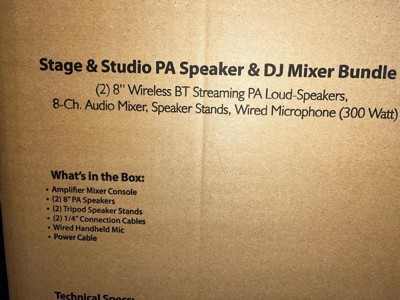 A: Hi, thanks for reaching out about the Pyle 300W All-in-One DJ Speaker & Mixer Bundle Kit - Bluetooth, 8-Channel Amplifier, 2 Speakers What's Included in the Box: Amplifier Mixer Console (2) 8-inch PA Speakers (2) Tripod Speaker Stands (For elevating the speakers to ear level) Wired Handheld Microphone (2) 1/4" Connection Cables (To connect the mixer to the speakers)Power Cable If you have any additional questions, we welcome you to contact MyTGTtech at 833-848-8324 every day between 7 am and 11 pm CST.
