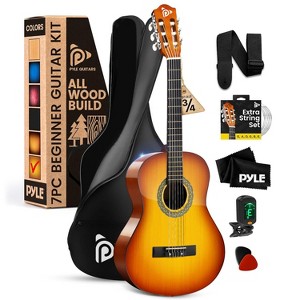 Explore the world of music with the Pyle 39" Classical Acoustic Guitar in a beautiful sunburst teardrop finish. This full-sized 6-string guitar is perfect for beginners and intermediate players, offering soft nylon strings for comfortable play and durable linden wood construction for a rich, warm tone. The dyed hardwood fingerboard and chrome gearheads ensure easy tuning and stable performance. With an included accessory kit containing a guitar bag, extra strings, picks, a capo, and a strap, you’re ready to play right out of the box. This guitar's fixed bridge system and classic design make it an excellent choice for budding musicians and enthusiasts alike.