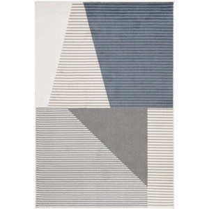 Designed to seamlessly integrate with contemporary aesthetics, the rug showcases a striking geometric pattern that effortlessly combines warm ivory tones with cool grey and bold navy, creating a visual statement that captivates and harmonizes with various interior palettes.