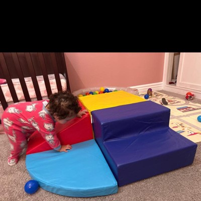 - Kids Soft Play Set Info: Yellow Block Size: 17.75" L x 17.75" W x 9.75" H. Light Blue Block Size: 17.75" L x 17.75" W x 2" H. Blue Block Size: 18" L x 18" W x 9.75" H. Red Block Size: 18" L x 18" W x 9.75" H. Suitable for 1-3 years. No assembly required.
