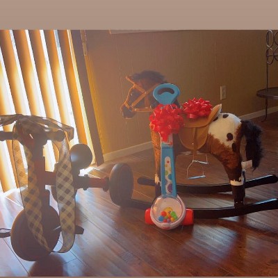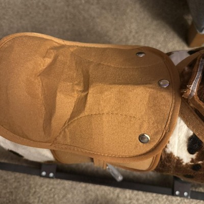 The horse is so cute! Unfortunately the first horse I got has some pretty big dings in the wooden rockers, clearly obvious to all. The saddle was also in pretty bad shape — wrinkled and looking “tired” right out of the box. We got handles for the toddler to hold on to, unfortunately, the fabric wasn’t cut to expose the screws!! We ordered a second horse, hoping it was a fluke. Thankfully we didn’t return the first kind because while the saddle looks great, there were still dings in the runners (less significant than the first. But, when I tried to put together, something was off. If the front right leg went through the hole to be bolted on, the left rear leg couldn’t! And visa versa. So the second horse couldn’t even be put together! (The 2nd horse did have the screws available to put the handles in, however). All in all I DO NOT recommend this purchase. For the price, I expected more.