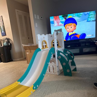 Qaba 5 in 1 Toddler Slide, Indoor Kids Slide Playset with Basketball Hoop, Climber, Telescope, Storage Baskets for 1-3 Years Olds, Yellow