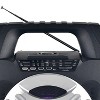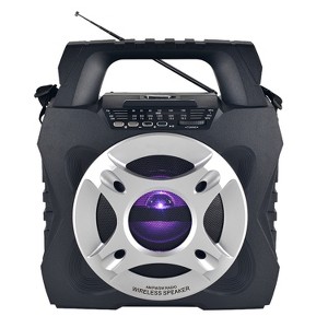 The QFX® R-45 is a solar rechargeable, 3-band AM/FM/SW radio with side flashlight and LED disco light behind the protective grille. You can stream music over Bluetooth®, enjoy radio broadcasts, plug into the aux input or play MP3 music files stored on USB drives and TF/microSD™ Cards. A 1/4-in. microphone input means you can even use it as a small PA speaker! The R-45 offers a telescoping antenna to help you achieve the best radio reception at your location and has an integrated carrying handle on top._