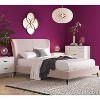 With a modern take on the classic wingback design, the Adele Upholstered Bed brings a sophisticated style to the bedroom or guest room. Dressed from headboard to frame in luxe velvet in whispery hues of blush or gray, the bed beckons one to stop and slumber for a while. Slender tapered legs in finely finished wood provide support for the bed in the most stylish of ways. Available in King or Queen versions, this upholstered bed with a calming aesthetic will make an impact both visually and by improving your sleep. Ideal for large to mid-size bedrooms or master bedroom suites.