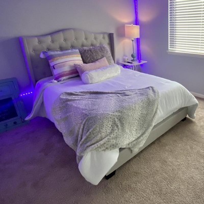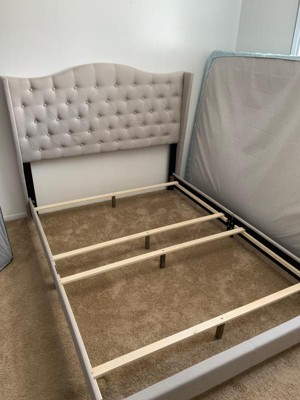 Have the bedroom or guest room of your dreams with the Alesha bed. The modern and contemporary-inspired design is evident in the clean lines and chic details of the bed. The Alesha's frame is built to last with engineered wood and rubberwood. The feet of the bed are finished in , complementing the neutral fabric upholstery of the frame and headboard. The headboard of the Alesha features a curved design with wings and buttons for an eye-catching look. The Alesha is made for use with a box spring and mattress. Made in Malaysia, the bed requires assembly.