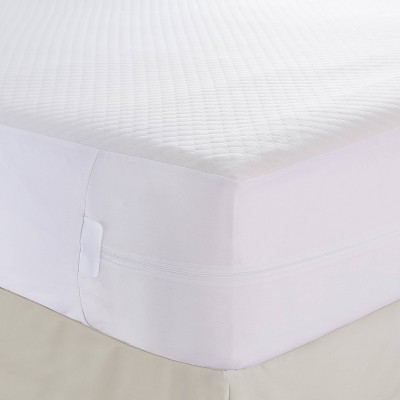 Fresh Ideas Mattress Guard Allergy Relief Zippered Mattress Protector is an effortless way to keep your mattress safe from unwanted allergens. Each mattress cover features a 3-layer micro-porous fabric that effectively blocks dust mites, allergens and bed bugs from entering the mattress. This protective layer is integral in ensuring your mattress investment lasts. Our bedding products come in high-quality construction to offer maximum durability and security. Rest easy knowing your mattress is secure. Shop our coordinating pillow protectors for complete bedding protection (pillow protectors sold separately). Machine washable. Available in twin, full, queen, king, and california king. 50% polypropylene/50% polyethylene. Fits mattresses up to 14" deep.