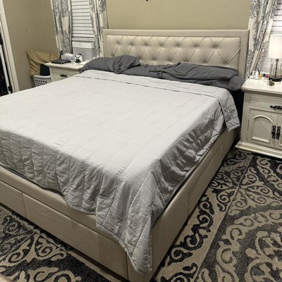 Being low on space doesn't mean you need to be low on style, and the Aurelie storage platform bed shows that. The modern and contemporary-inspired style is evident in the square headboard and neutral color. The Aurelie's headboard even has a touch of the luxe and glam look with it's foam-padded, button-tufted panel. The bed offers storage options with four convenient drawers in the base. Saving space and looking good are easy with the Aurelie's all-over fabric upholstery. This bed will be a delightful addition to your bedroom or guest room. The Aurelie is designed for use with one mattress only and comes with fourteen roller slats. Made in Malaysia, this storage platform bed requires assembly.
