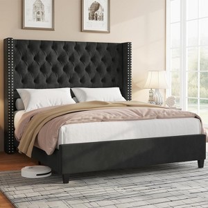 AMERLIFE Bed Frame with Deep Button Tufted and Velvet Wingback Headboard,No Box Spring Needed
