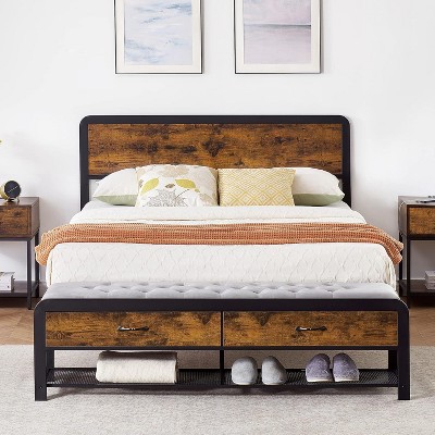 Queen&Full Bed Frame with Storage, Upholstered Headboard & 2 Large Drawers, Ottoman Bench Footboard, Metal Slat Support System, Easy Assembly